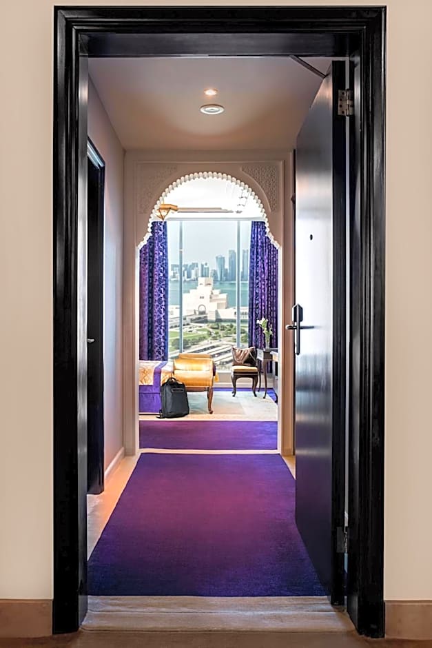 Suite with Sea View is consists King Bed, Living Room, 52' TV with satellite channels, Free Wi-Fi, Tea /Coffee making facility, daily 2 bottles of mineral water, daily housekeeping cleaning service, safety deposit box, attached bathroom, mini bar, Corniche View and the size of the room is 65 square yard